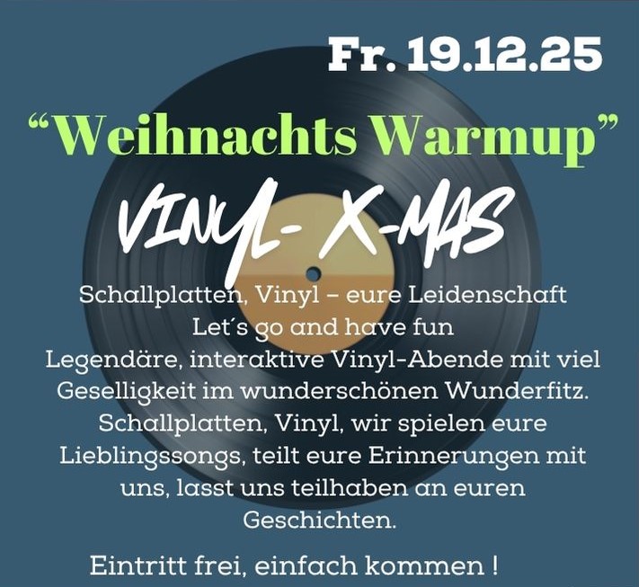 Vinyl & Freunde – Weihnachts-Warm-up im Wunderfitz Fr, 19. Dezember 2025 Bevor der Weihnachtsrummel richtig losgeht, laden wir euch zu einem entspannten Abend voller Musik, Begegnung und guter Stimmung ein.Unser Vinyl-Abend ist genau das Richtige, um zur Ruhe zu kommen, zu lachen, sich zu treffen und einfach Zeit miteinander zu verbringen. Bringt eure Lieblingsplatten mit […]